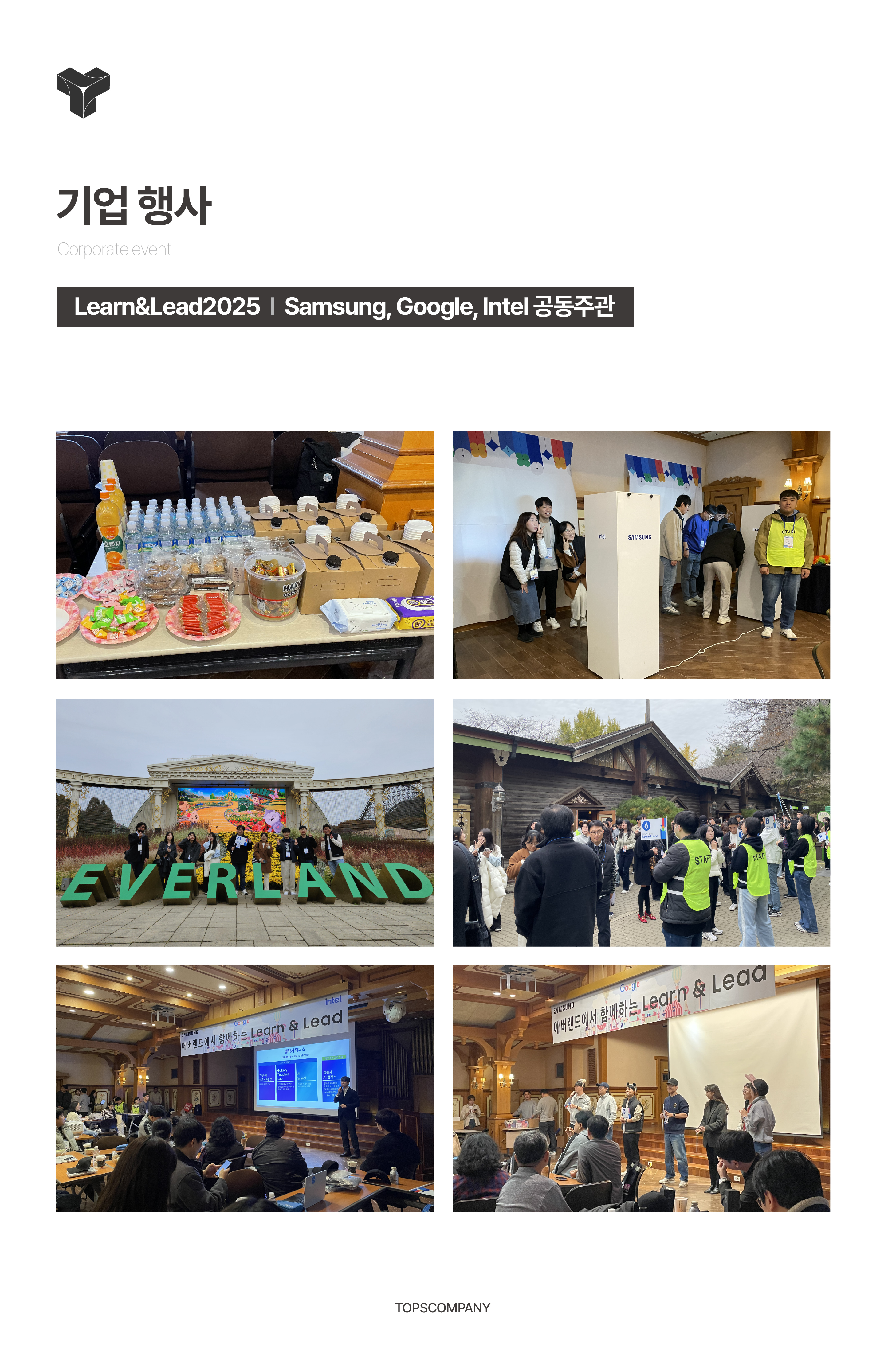 ![]() 탑스컴퍼니는 기업 행사, 프로모션, 교육행사 등 다양한 현장 경험에 기반한 기획 및 운영 서비스를 제공합니다. 수도권을 중심으로 공공기관 및 민간기업과 협업해온 종합 행사 및 프로모션 전문 기업입니다. 본 프로젝트는 교육행사를 중심으로 한 TOPS COMPANY의 운영 경험을 바탕으로 진행되었습니다. |